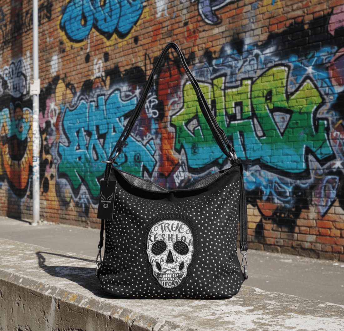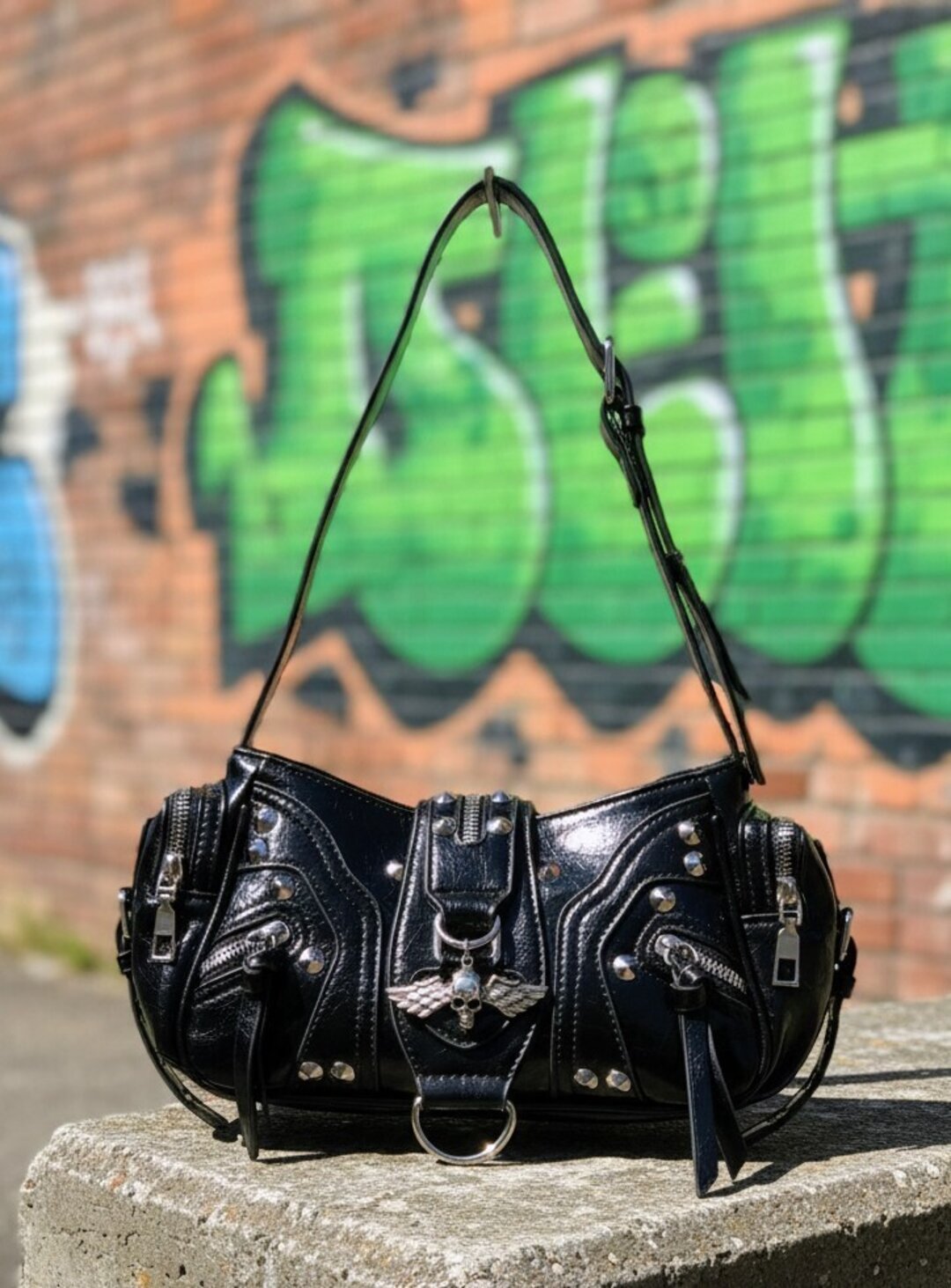 ☠️ Dark Skull es el bolso gótico-rock definitivo: negro brillante con tachuelas, cremalleras y una...