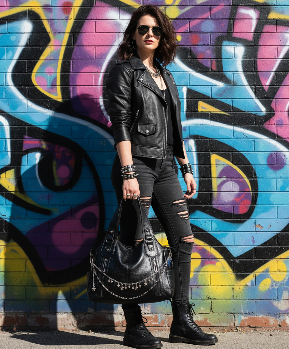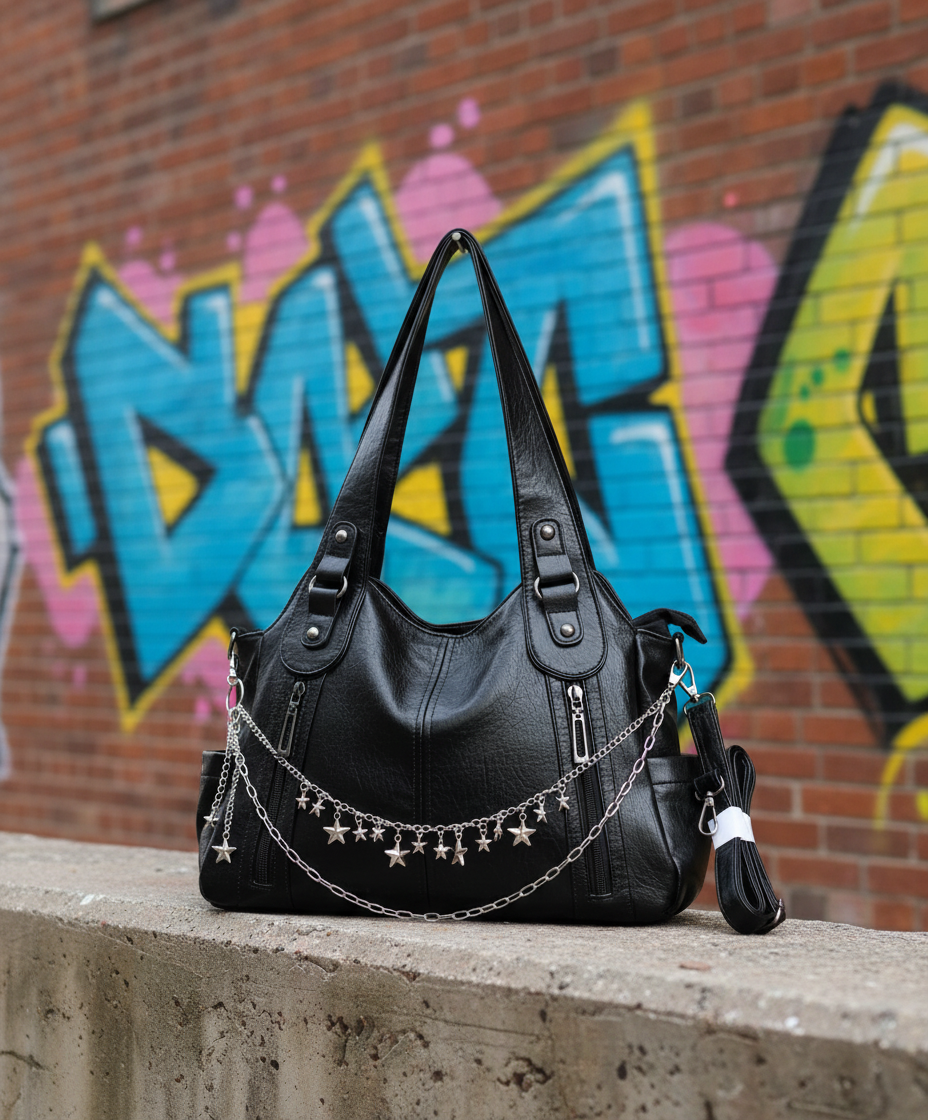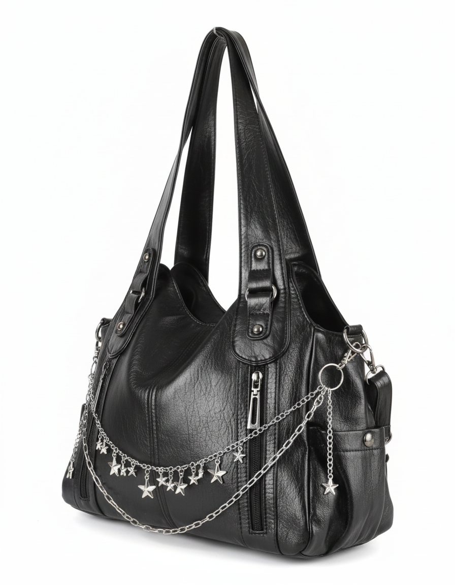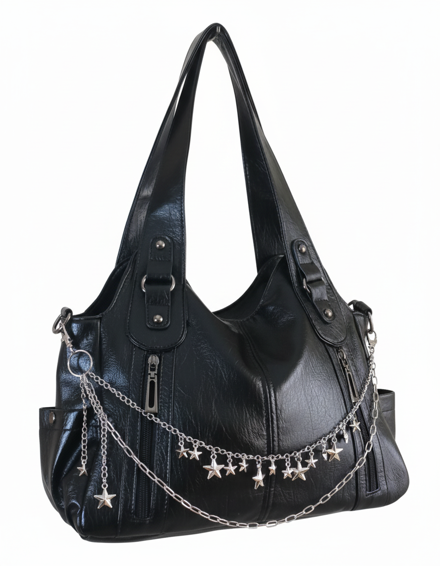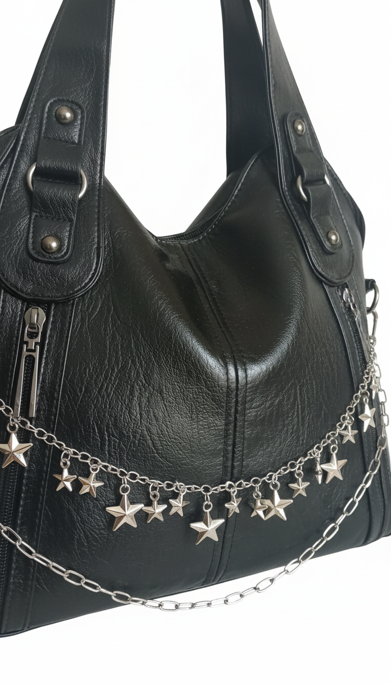 ★Black Star es el bolso que brilla sin necesidad de exagerar. Su diseño en piel sintética negra combina elegancia urbana con un toque alternativo gracias a su cadena frontal con estrellas metálicas. Es amplio, resistente y perfecto para el día a día, ya sea para ir a clase, al trabajo o para un look casual con actitud.