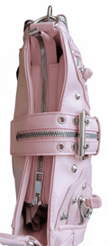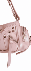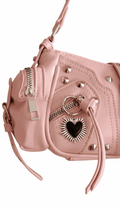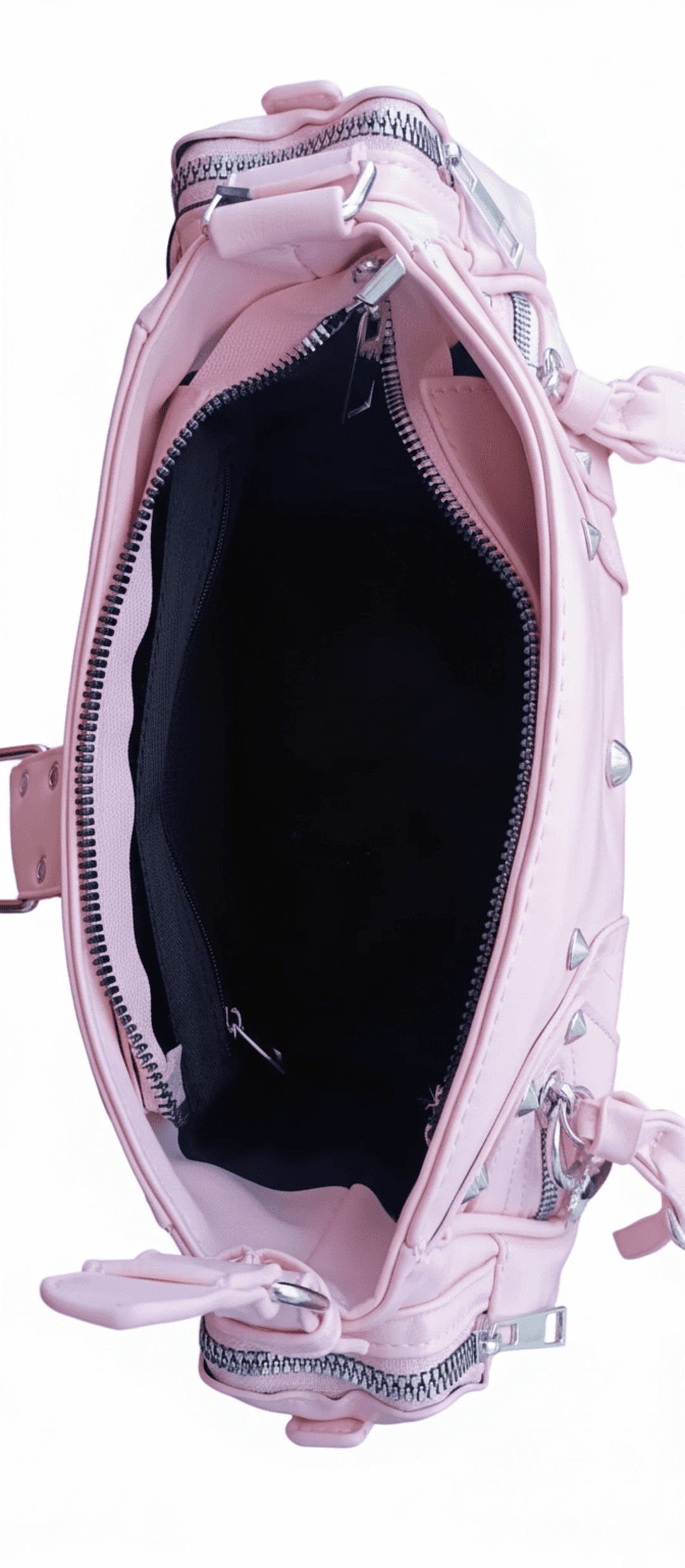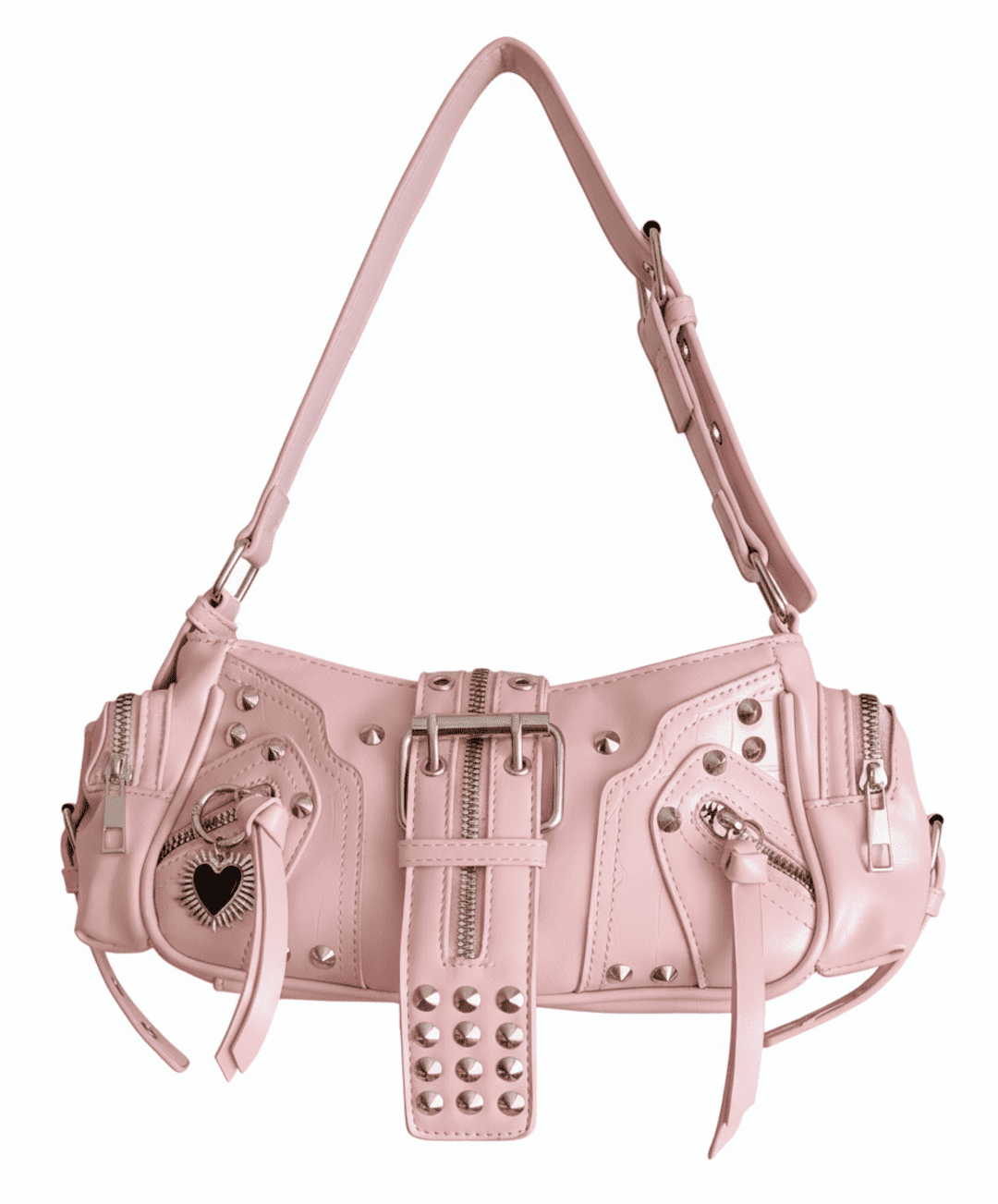 💗Pink Lip es un bolso urbano con estética Y2K y un toque glam‑punk irresistible. Fabricado en piel sintética rosa, combina tachuelas, cremalleras y hebillas plateadas con un adorno de corazón plateado y negro que aporta contraste y actitud. Su diseño semi cilíndrico y compacto lo hace perfecto para llevar en el hombro o en la mano gracias a su correa ajustable.