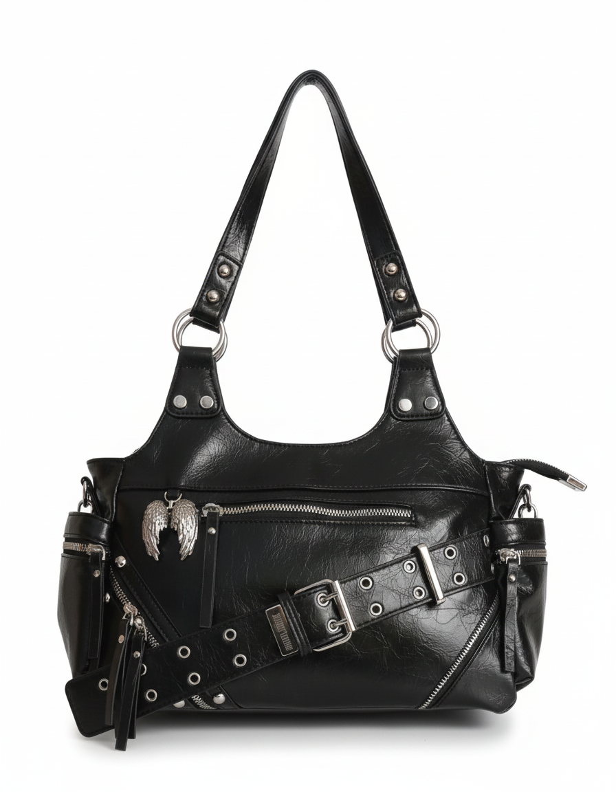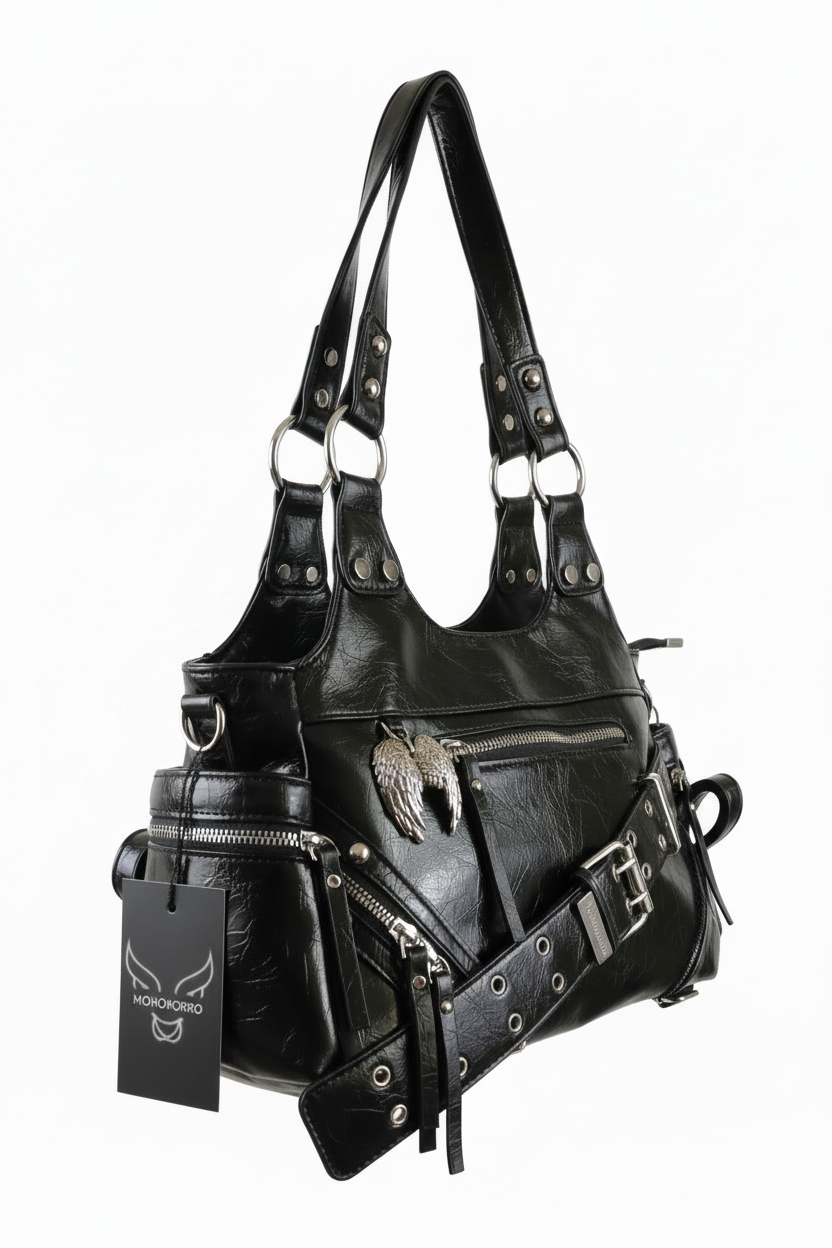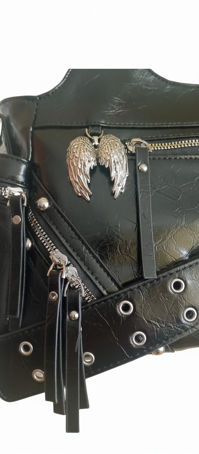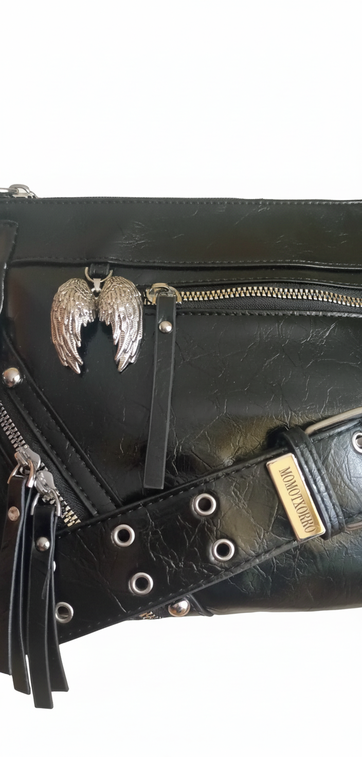 🖤Silver Wings es un bolso pensado para quienes llevan un toque de rebeldía en el día a día. Su diseño en piel sintética negra combina estética urbana con un aire místico gracias a su adorno metálico de alas plateadas, un detalle que lo convierte en una pieza única dentro del estilo alternativo.