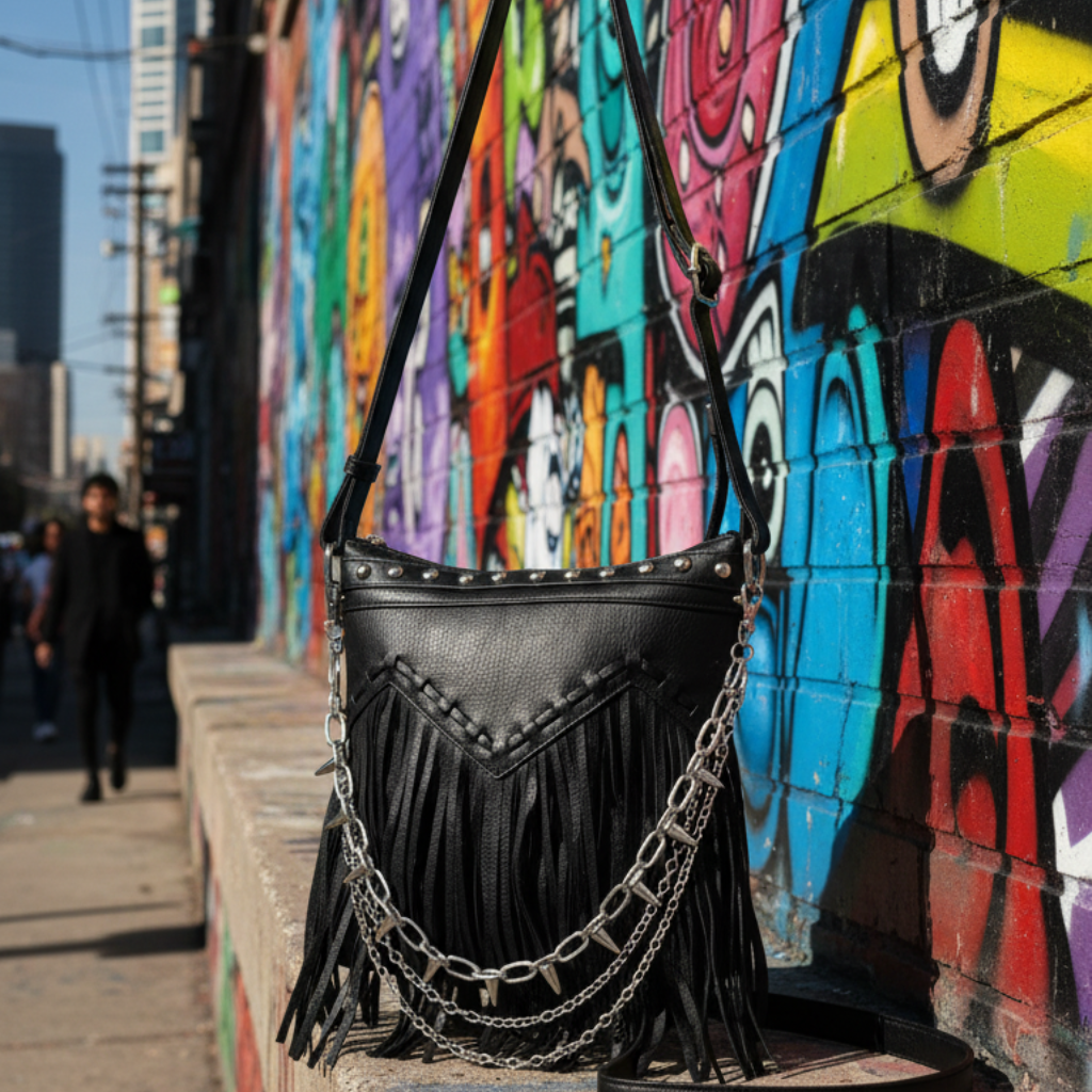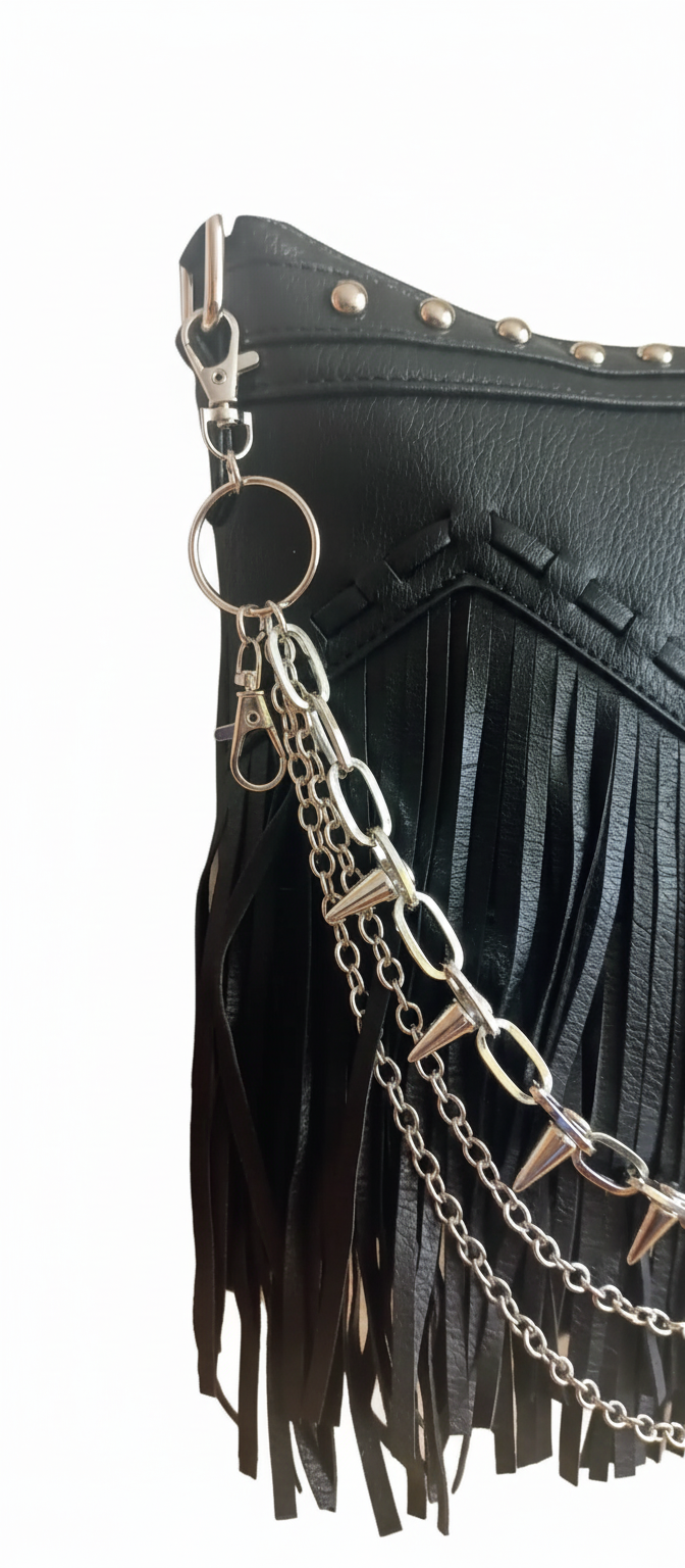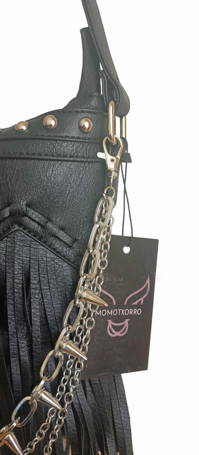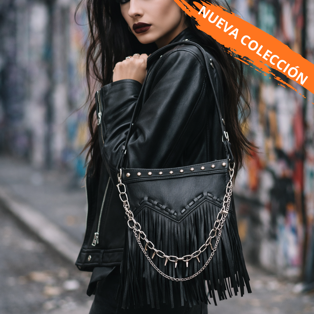 🔗Urban Spikes es un bolso creado para quienes viven la ciudad con actitud. Su diseño en piel sintética negra combina un estilo urbano con un toque rebelde gracias a sus cadenas plateadas con pinchos, que aportan carácter sin perder elegancia. Los flecos añaden movimiento y personalidad, convirtiéndolo en un accesorio que destaca incluso en los looks más sencillos.