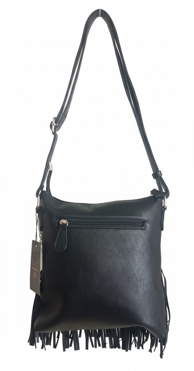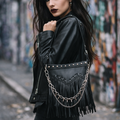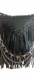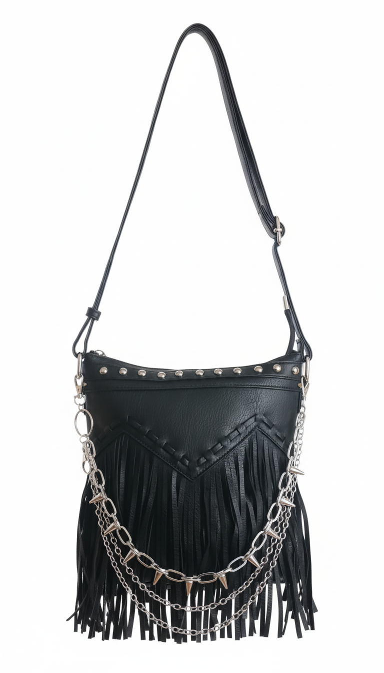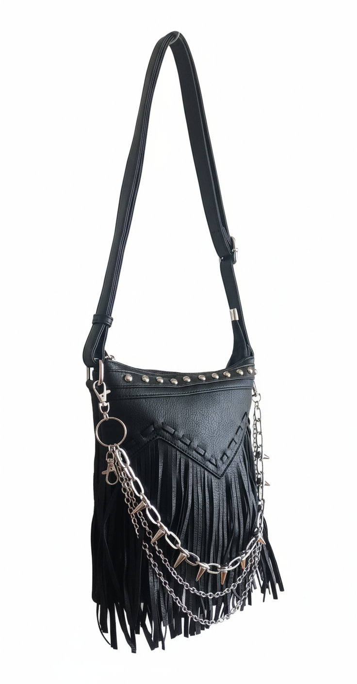 🔗Urban Spikes es un bolso creado para quienes viven la ciudad con actitud. Su diseño en piel sintética negra combina un estilo urbano con un toque rebelde gracias a sus cadenas plateadas con pinchos, que aportan carácter sin perder elegancia. Los flecos añaden movimiento y personalidad, convirtiéndolo en un accesorio que destaca incluso en los looks más sencillos.