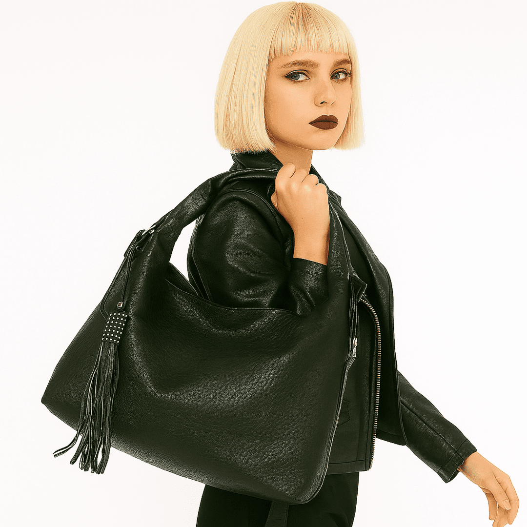 🖤Piel sintética negra con textura suave Material resistente y visualmente impactante, ideal para el día a día.