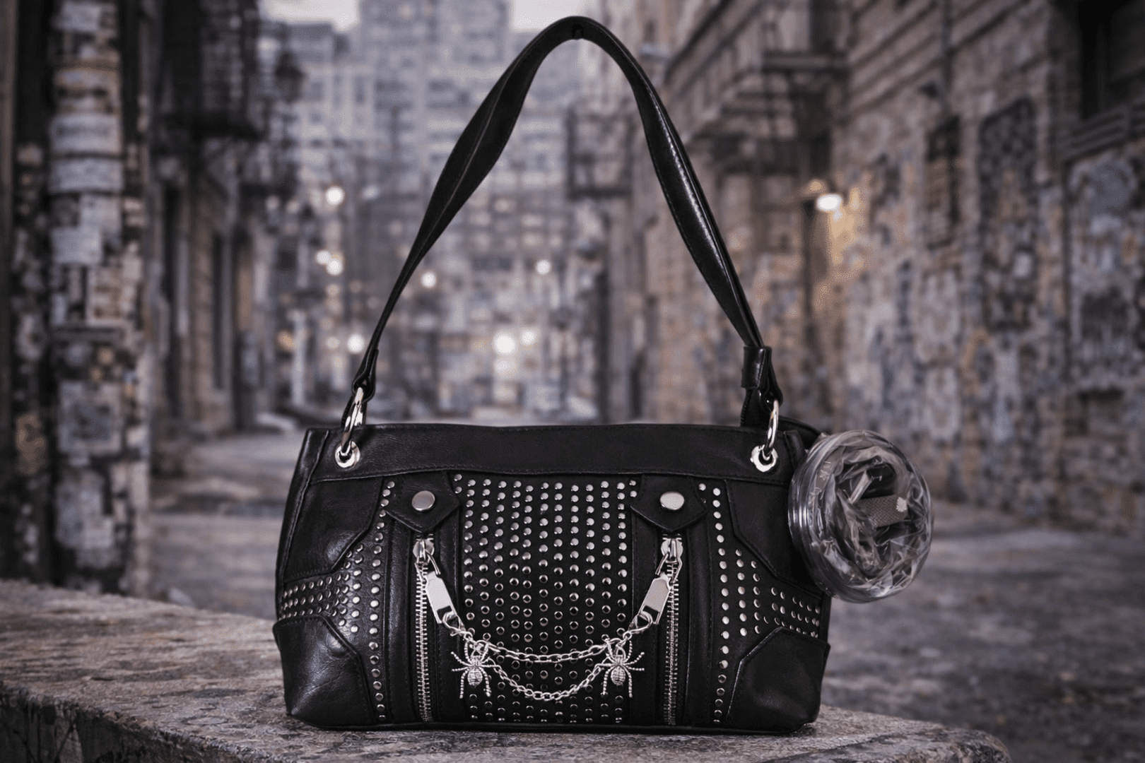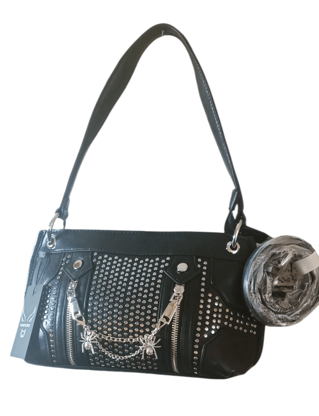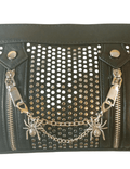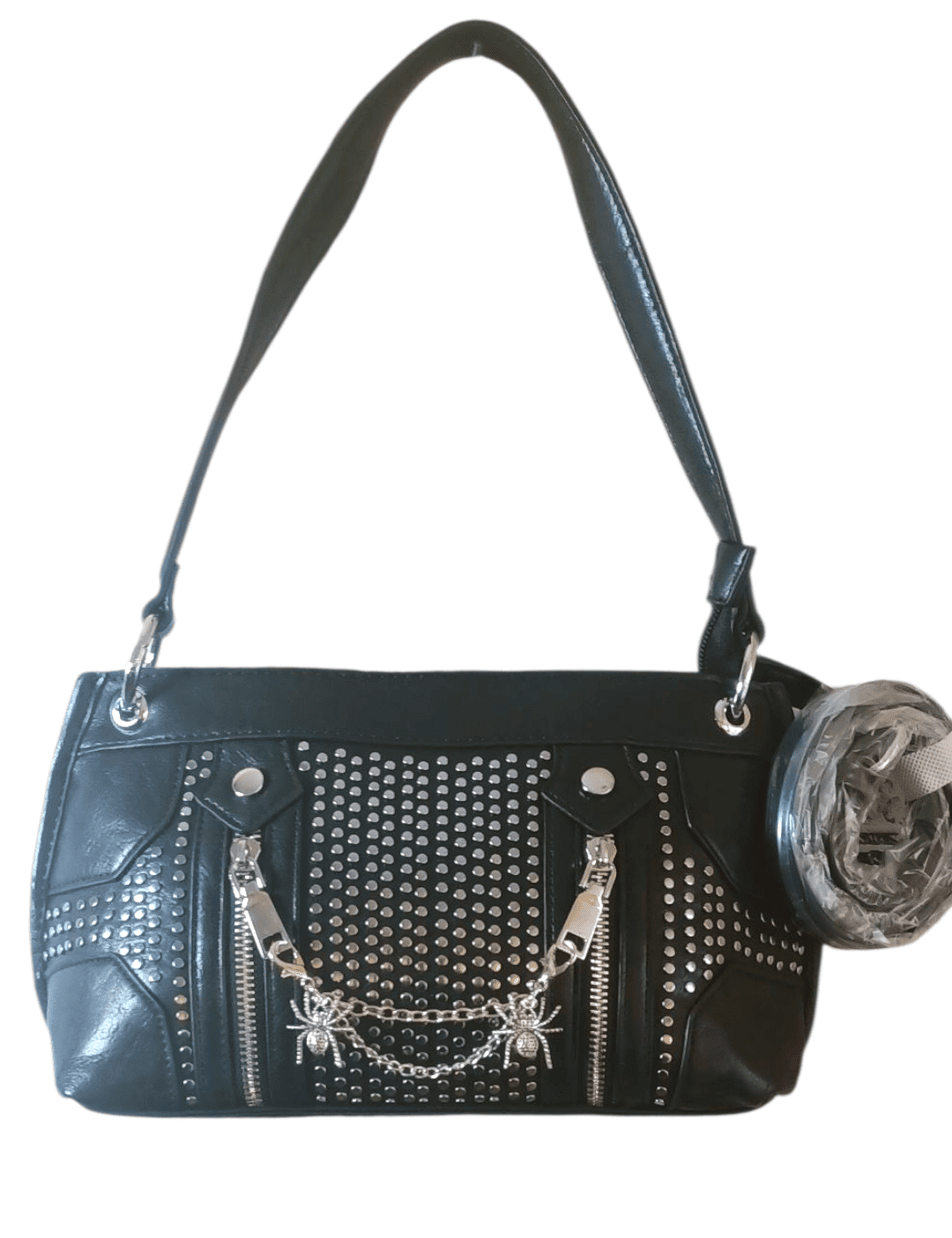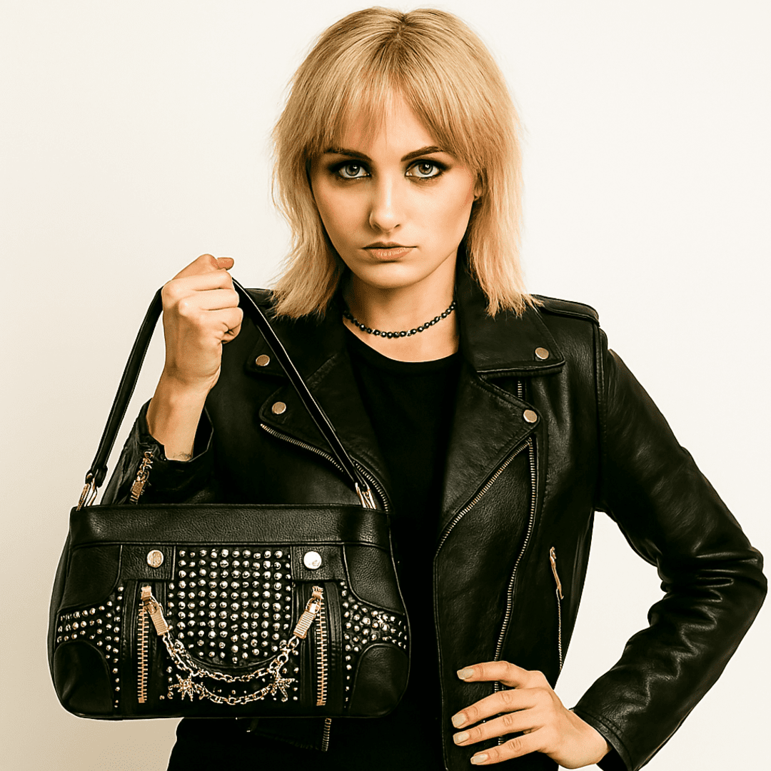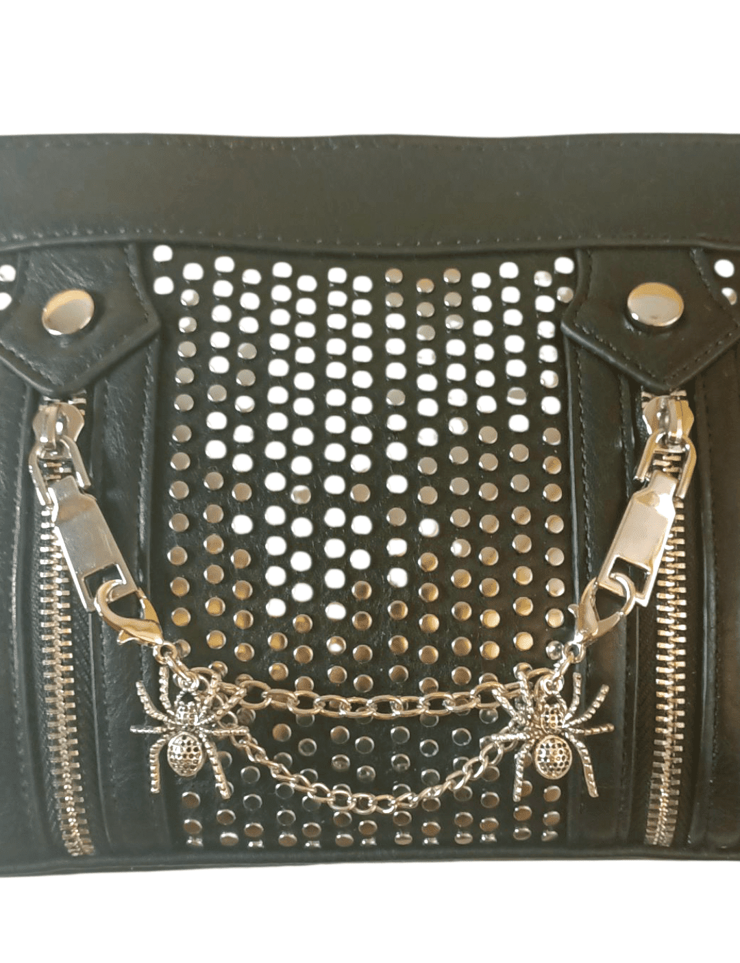 🕸️Black Widow es el bolso que encarna la elegancia oscura con un giro punk. Fabricado en piel sintética negra, sus medidas de 32x17x10 cm lo hacen compacto pero con presencia. Las tachuelas plateadas, las cremalleras verticales y la cadena con dos arañas metálicas lo convierten en un accesorio provocador.
