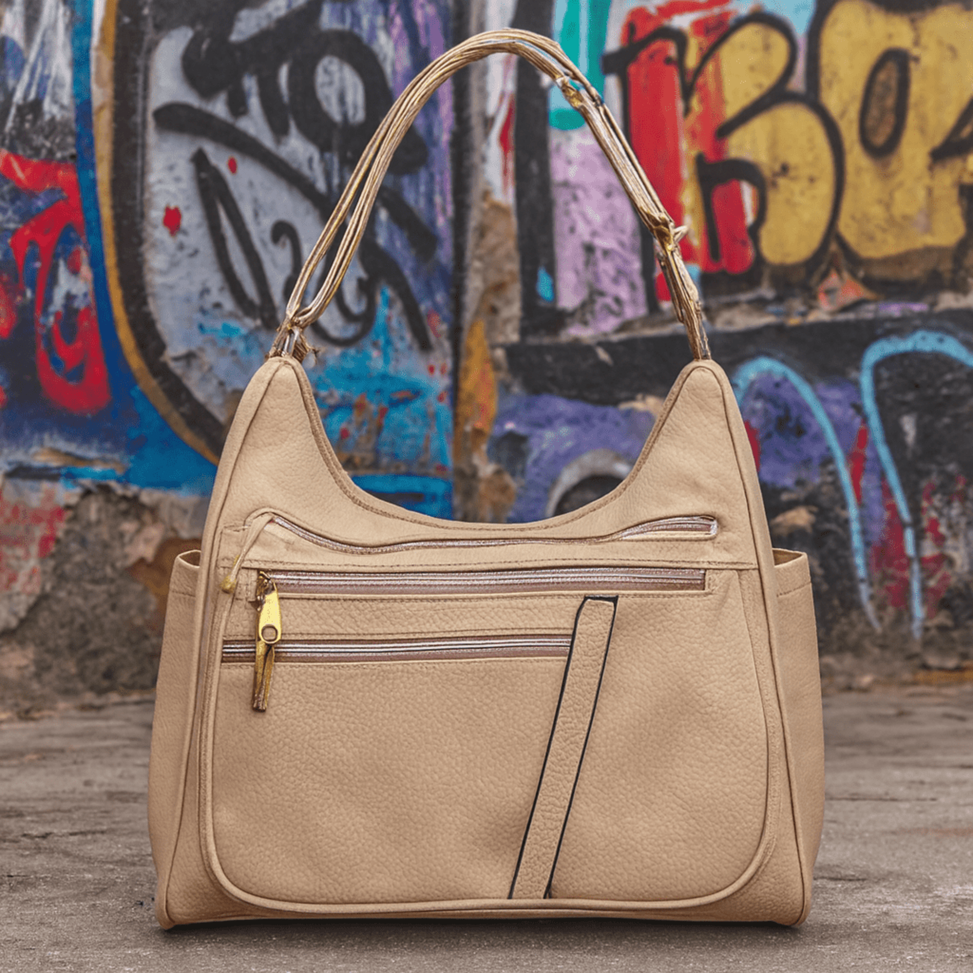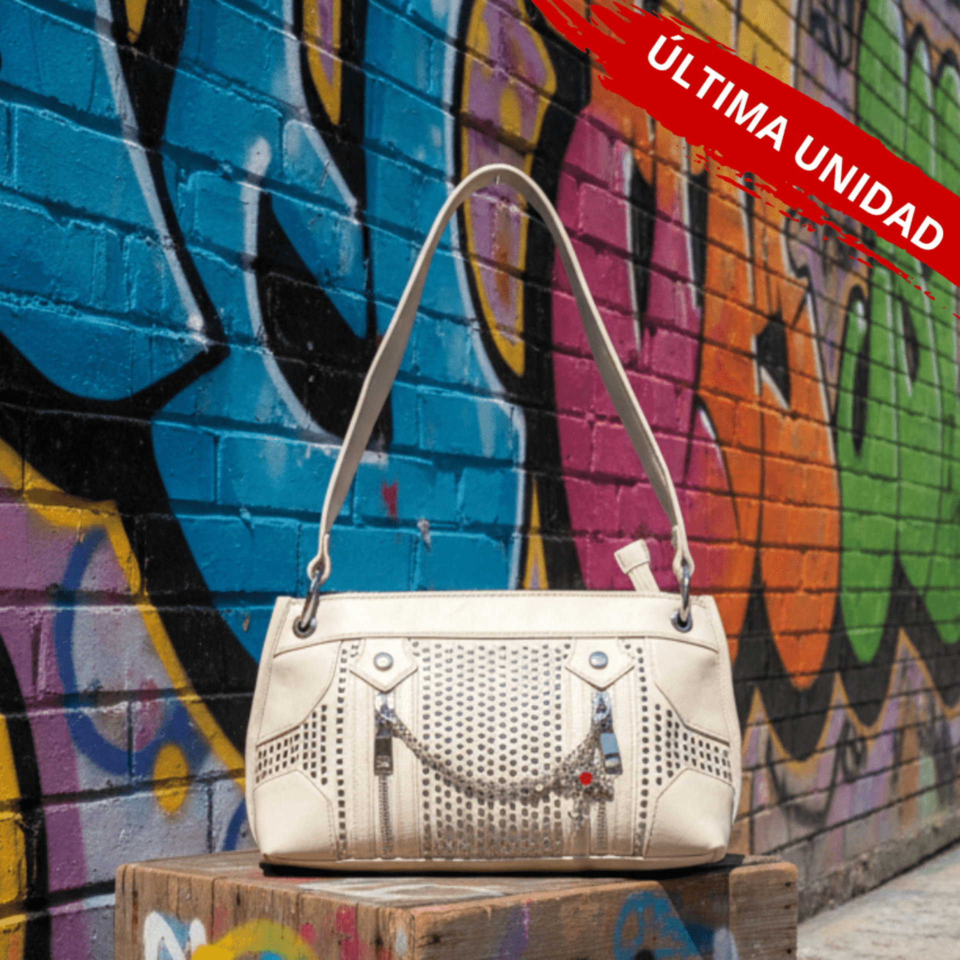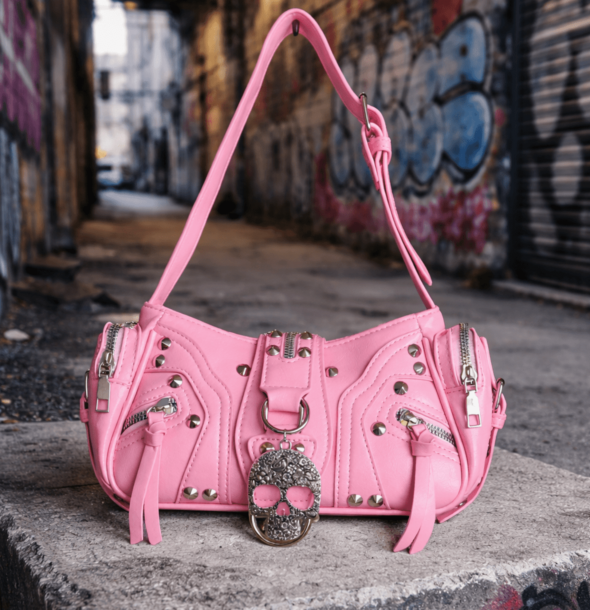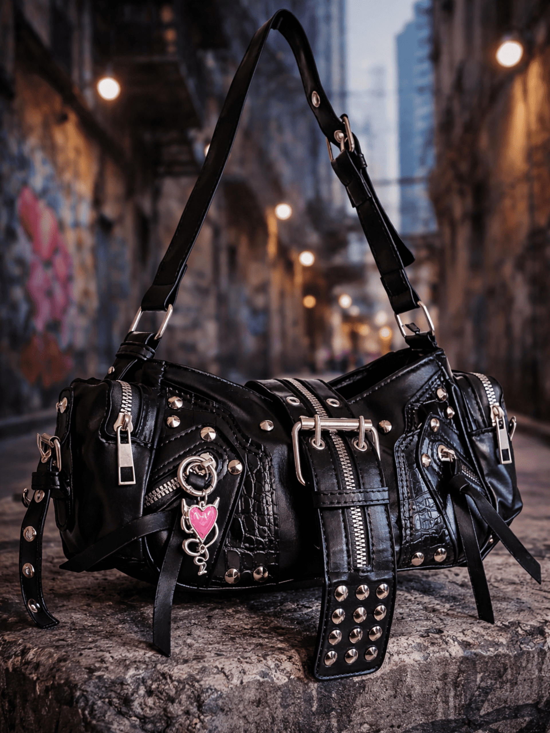 Bolso negro estilo gótico-rock con tachuelas, cremalleras y un toque de amor rebelde.